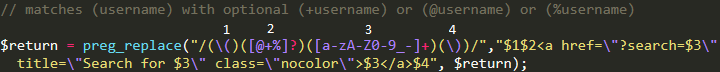 This regex is the first parameter of a preg_replace PHP function. Once the criteria for text that matches all of these is met, PHP will replace the entire string with the text in the next parameter, and replace each instance of $1, $2, $3 and $4 with the corresponding matched text, which happens to be separating the usernames from the rest of the text, and creating a link that will search for other usernames in the database. The \'s that you see here are escape characters so that the quotes and parentheses are not incorrectly considered the end of the parameter.